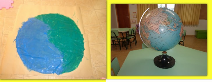 No Espaço de Convivência da Educação Infantil, levamos nosso globo terrestre, as imagens pesquisadas previamente com as famílias e estudantes e fantoches para relembrar a história da criação.
